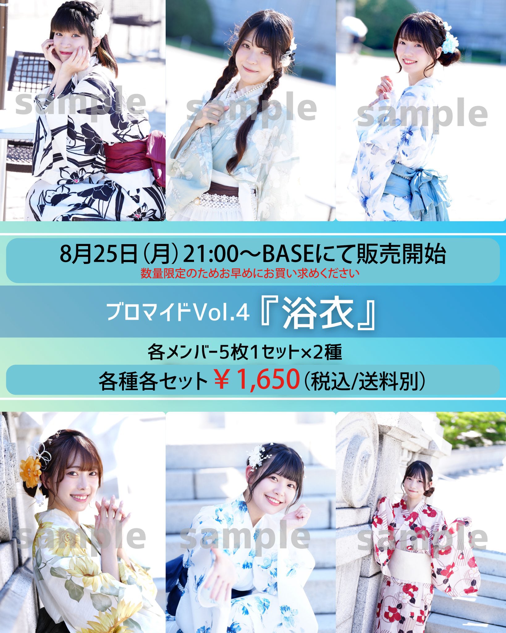 ブルーなままでのメンバーによる浴衣姿のブロマイドを、各メンバー5種揃ったセットを2パターン(Aセット、Bセット)ご用意しました。この特別なブロマイドは、浴衣を身にまとったメンバーたちの魅力を余すところなく捉えています。(猛暑での撮影をメンバー全員頑張りました…!)